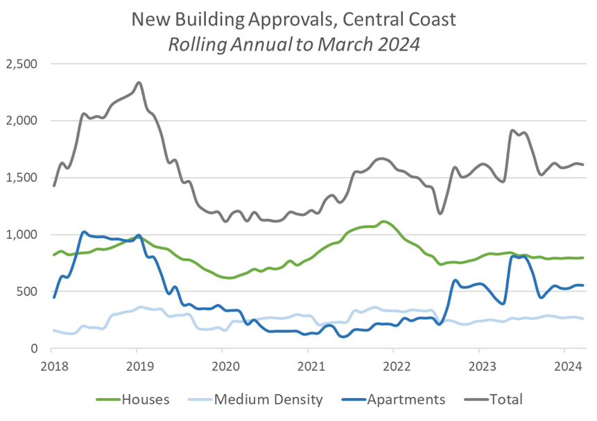 Today, ABS released the latest Update of Building Approvals data and this shows the Central Coast is still at the low bar, currently underpinning council and state government planning assumptions. The data also shows a worrying trend that building approvals are not improving and shows that all typologies are still well below their peak.