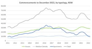The 54% annual decline in apartment commencements is also the steepest annual decline that any housing typology has experienced in NSW over the last 10 years.