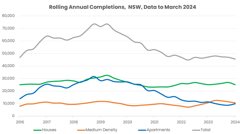 For the 12 months to March 2024, NSW recorded just over 45,600 newly completed residential dwellings. This is the second lowest number of completions in the last nine years in NSW and puts 40% behind the annual target of 75,000 new homes a year.