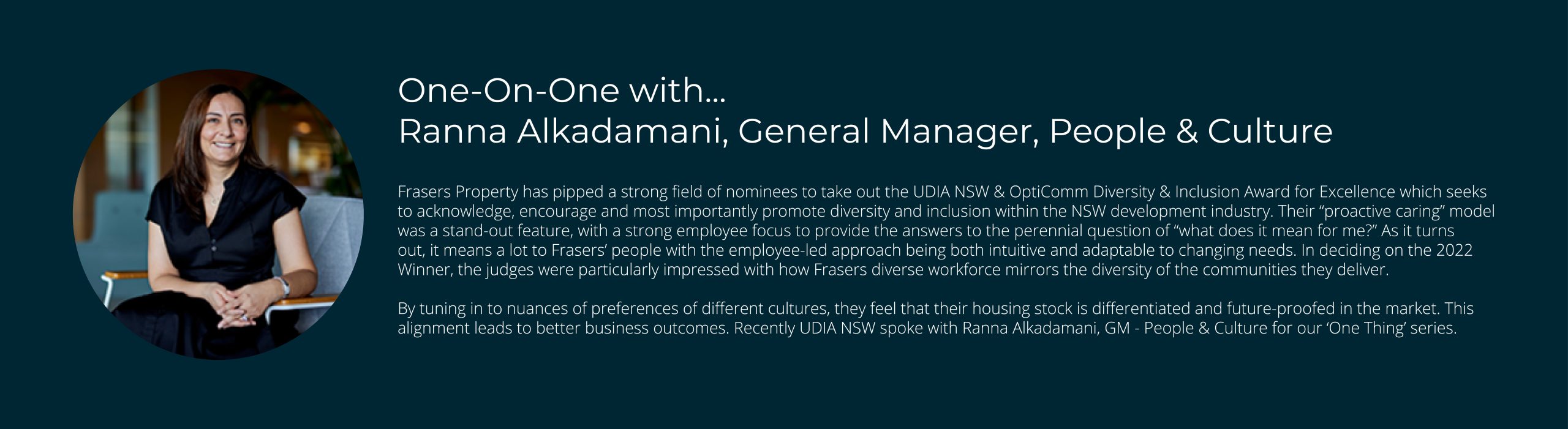 This interview forms part of a UDIA D&I Committee initiative series to encourage and highlight more diversity in UDIA and the property industry. It is intended to highlight diversity by profiling our members through industry publications on a regular basis throughout the year. Thank you to Ranna Alkadamani, General Manager, People & Culture, Frasers Property.
