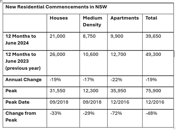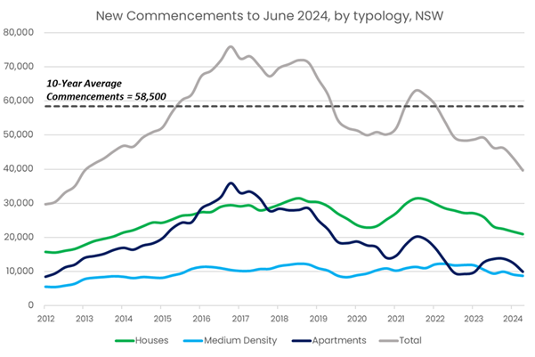 In the 12 months to June 2024, new residential commencements recorded their lowest annual total in 11 years in NSW, compounded by a nose dive in apartment commencements to 9,900, which sits 72% below its 2016 peak.