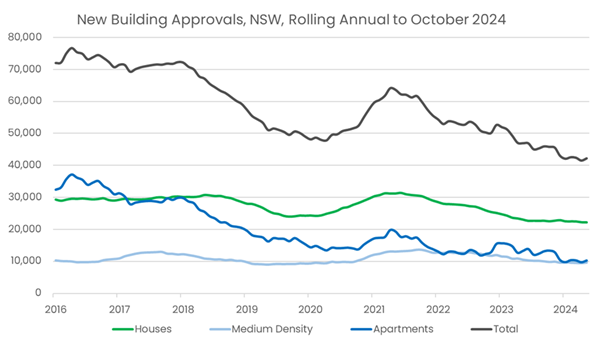 Today’s data shows another 12-month period of sliding approvals, revealing that approvals to October 2024 fell 10% across NSW compared to the year earlier to 42,200. This keeps new building approvals at 45% below the September 2016 peak, which aligns closely with the annual target for completions in NSW under the National Housing Accord of 75,600 new homes.