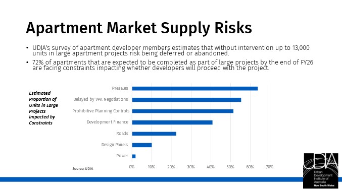 Based on a UDIA survey of development members, 72% of apartments that are expected to be completed as part of large projects in NSW by the end of FY26 are facing constraints impacting whether developers will proceed with these projects. UDIA estimates that without intervention, up to 13,000 units in the project pipeline risk being deferred or abandoned. See graph below: