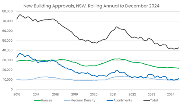 The data released today revealed that the 42,800 new building approvals across NSW in 2024 were 5% below that of 2023, and a significant 42% lower than the calendar year peak of over 73,000 approvals in 2016.