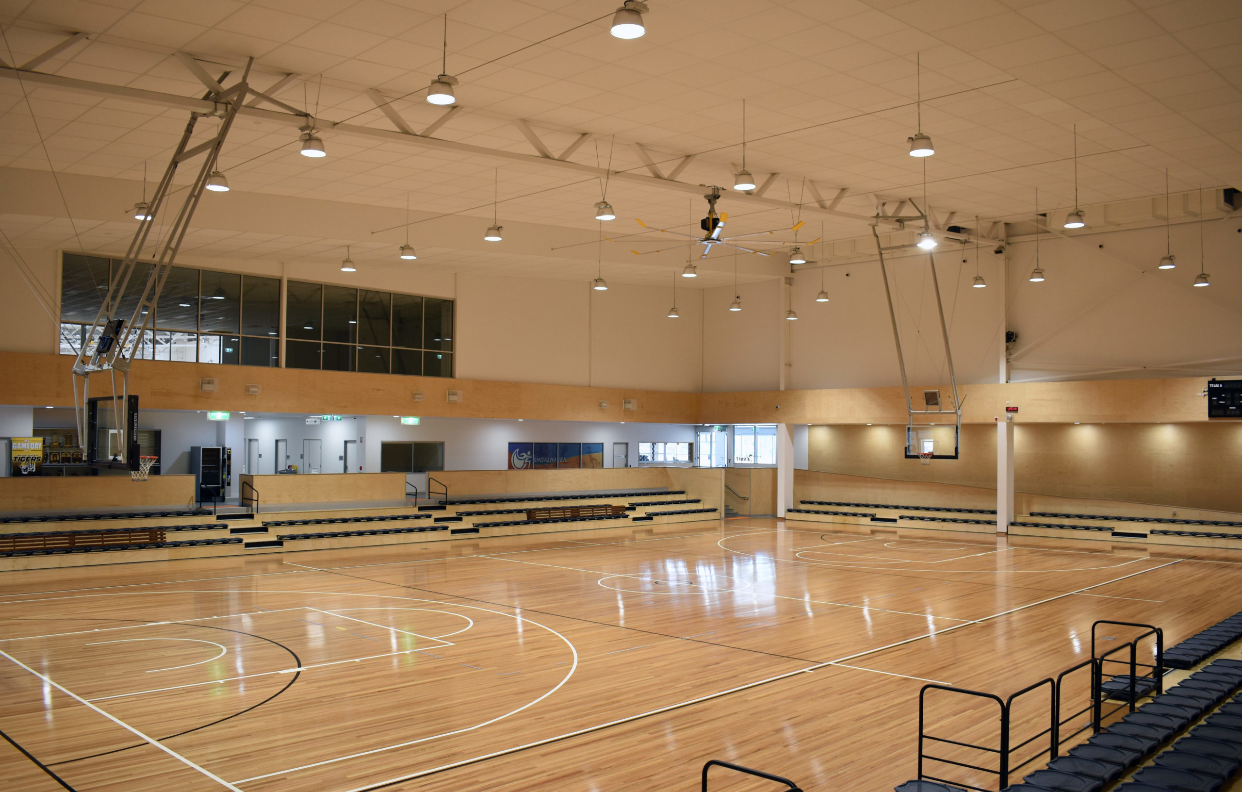 Shoalhaven Indoor Sports Centre provides a modern facility compliant with relevant sporting codes, incorporating four multi-purpose courts, meeting/conference rooms, offices, child-minding, fitness, show court grandstand, multiple changerooms, referee facilities along with public toilet facilities, kitchen and indoor/outdoor café social areas. The precinct spans a 5,703 m2 building floor area and 47,000 m3 total precinct volume, costing $13.6m; the Centre is the only Indoor Sports Centre of its kind outside Sydney metropolitan, developed to address the growing need for indoor sporting facilities within Shoalhaven, whilst maintaining opportunities to attract larger sporting events and activities that create broader regional economic development benefits.